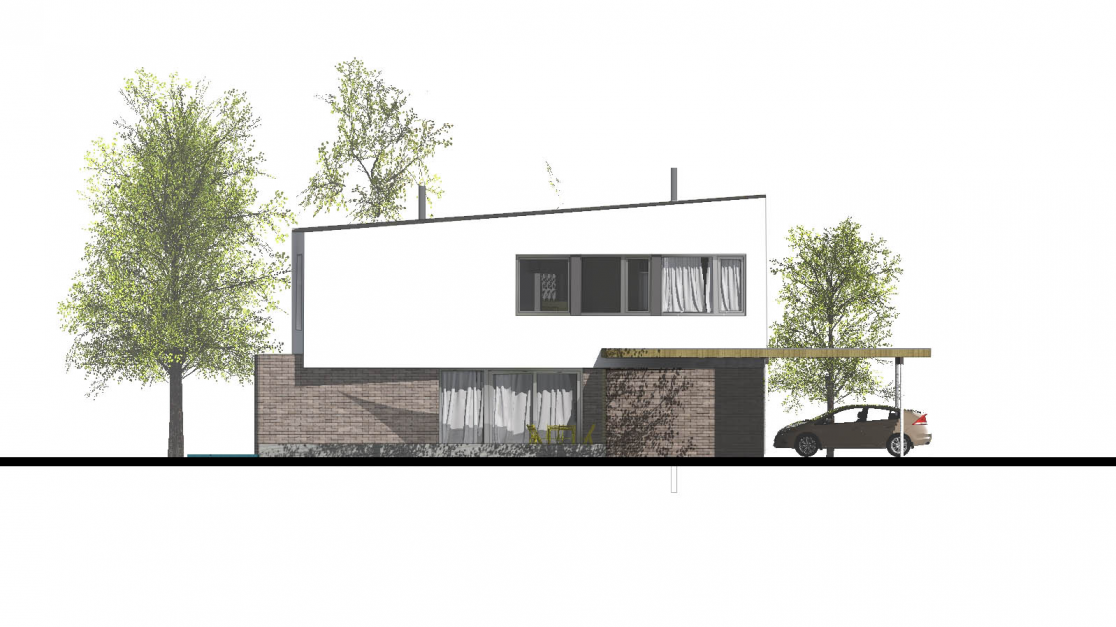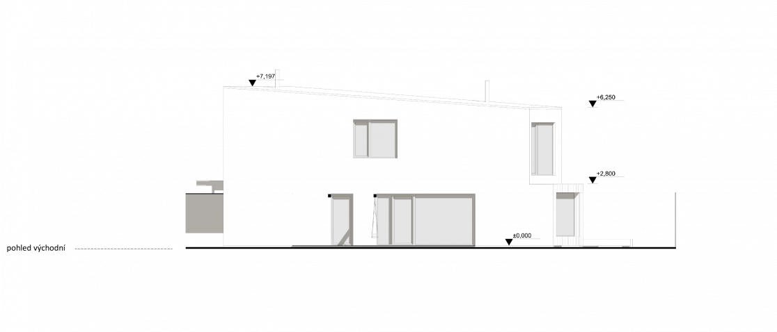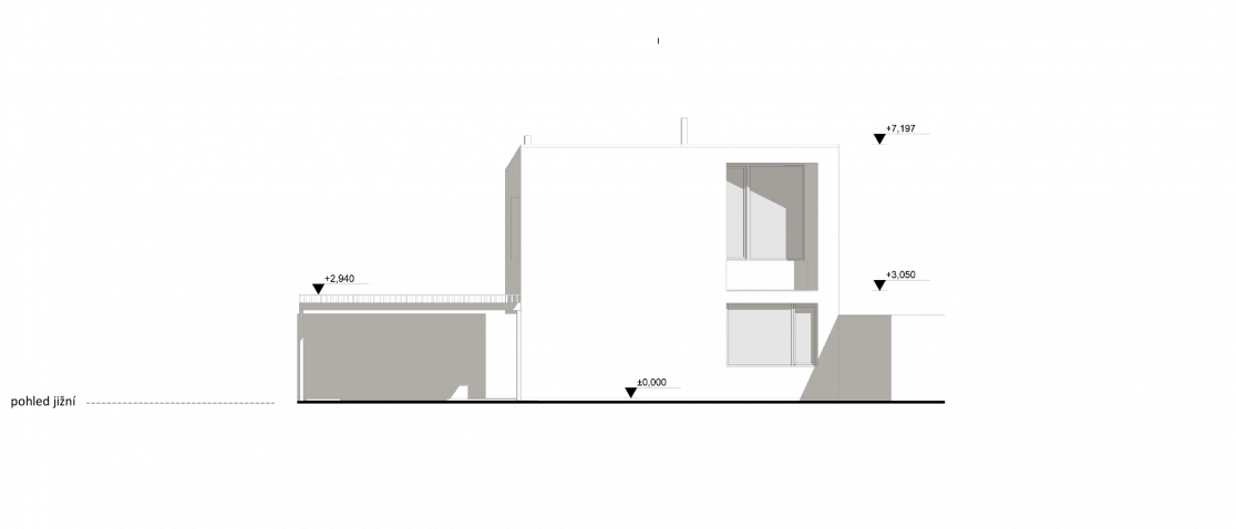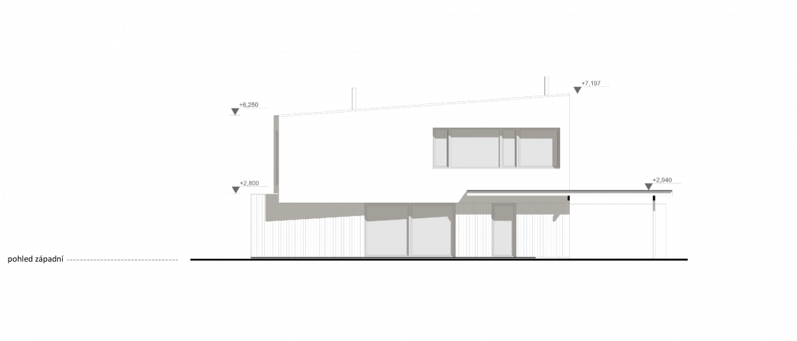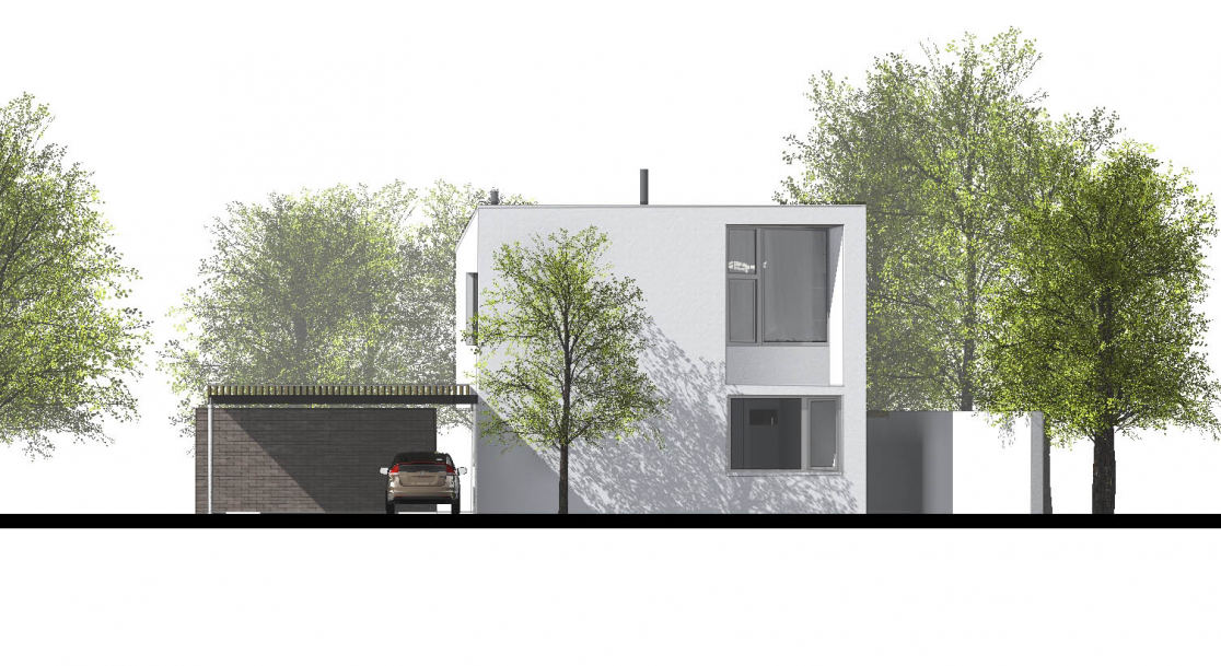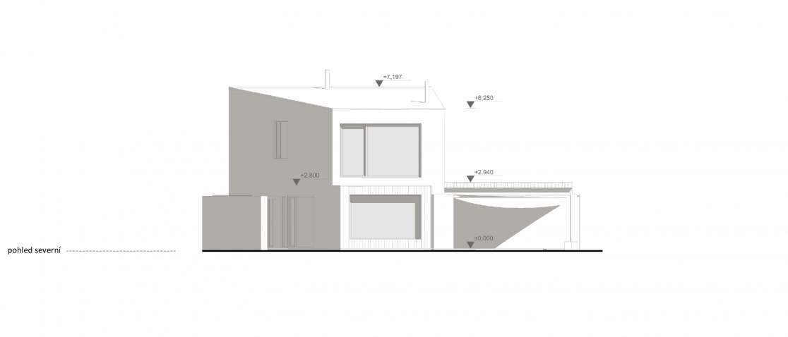 Základní tvar domu reaguje na geometrii pozemku. Jednoduchá lichoběžníková hmota je jižní hranou postavena rovnoběžně s ulicí, zatímco východní a západní hrany rodinného domu víceméně kopírují hranice sousedních pozemků. Severní krátká strana pak nabízí rámovaný pohled do zahrady. Horní podlaží je vůči severní frontě mírně odstoupeno, naopak na západ mírně přesahuje. Vůči celkové ose pozemku je objekt vyosen směrem k východu na minimální odstup. Ze západní strany tím vzniká prostor pro přístřešek na parkování a terasu s bazénem.