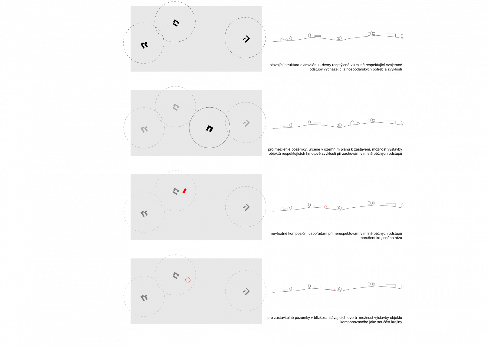 vzdálenosti vycházejí přímo z hospodářských potřeb. Územní plán obce, která se pyšní celou řadou kulturních nemovitých památek vesnického charakteru, chrání svými typologickými a tvarovými požadavky místní ráz domů. Pro výstavbu v samotné obci či na samostatných pozemcích v krajině, které respektují výše zmíněné vzdálenosti je tento požadavek zcela legitimní. Nic méně pozemek záměru leží v bezprostřední blízkosti stávajícího historického dvorce a autoři studie se domnívají, že umístěním klasického