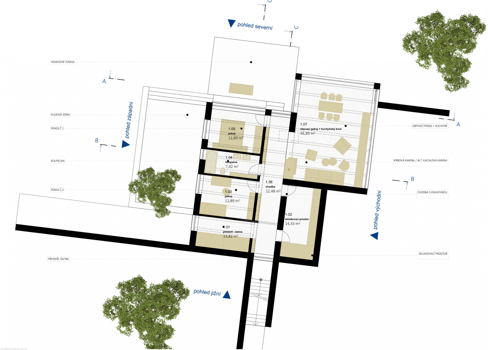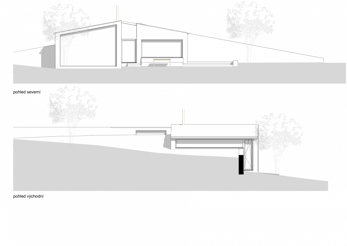 Dispozice je vázána na hlavní severojižní osu, na jejímž horním konce je přístupové schodiště pro návštěvy ústící přímo do komunikačního prostoru, který je součástí hlavní obytné místnosti a je zakončen výhledem do zeleně. Ze západní strany je připojen vstup od parkingu přes zádveří a křídlo ložnic s hygienickým zázemím. Z východu pak navazuje centrální obytný prostor s kuchyní, který je umístěn na nižší výškové úrovni. Středem tohoto prostoru je krb. Závěr tvoří venkovní terasa jako další přirozená místnost. U vnitřního vyrovnávacího schodiště se předpokládá variabilní přeměna na bezbariérovou rampu.