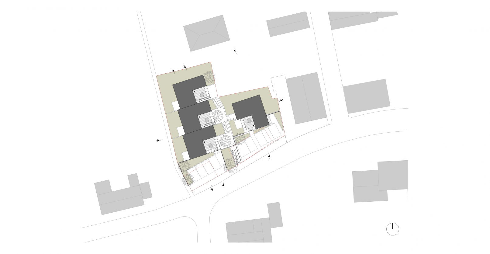 Koncept je založen na vytvoření dvou oddělených hmot – podél západní hranice parcely stojí větší z nich, ve které se nachází šest bytových jednotek, blíže k východní hranici pak stojí menší hmota se dvěma bytovými jednotkami. Podél jižní hranice pozemku – v místě, kde parcela sousedí s ulicí Postřižínská – je situováno parkování. Středem pozemku vede společný polosoukromý prostor. Svažuje se ve směru stávajícího terénu směrem k severní hranici pozemku a je tvořen třemi vyrovnávacími schodišti, mezi kterými jsou proloženy rovné terasy, z nichž je nástup do jednotlivých bytů. V přízemí se nacházejí celkem čtyři byty 3+kk přístupné přímo z parteru, každý z nich má za domem vlastní zahradu. Dále je z parteru umožněn výstup do dvou bytů 2+kk, které se nacházejí ve 2NP a každý z nich je přístupný po vlastním schodišti přes vlastní terasu. Poslední dva byty 2+kk jsou přístupné přímo z úrovně parkovacích stání. Zajištění soukromí na terasách horních bytů je řešeno pomocí vestavěných květinových truhlíků, umožňujících vysazení středně vysoké zeleně v podobě keřů. Zatímco dva byty 3+kk v přízemí mají vlastní sklep přístupný ze své zahrady, ostatní byty mají společný prostor situovaný pod západní polovinou parkovacích stání.